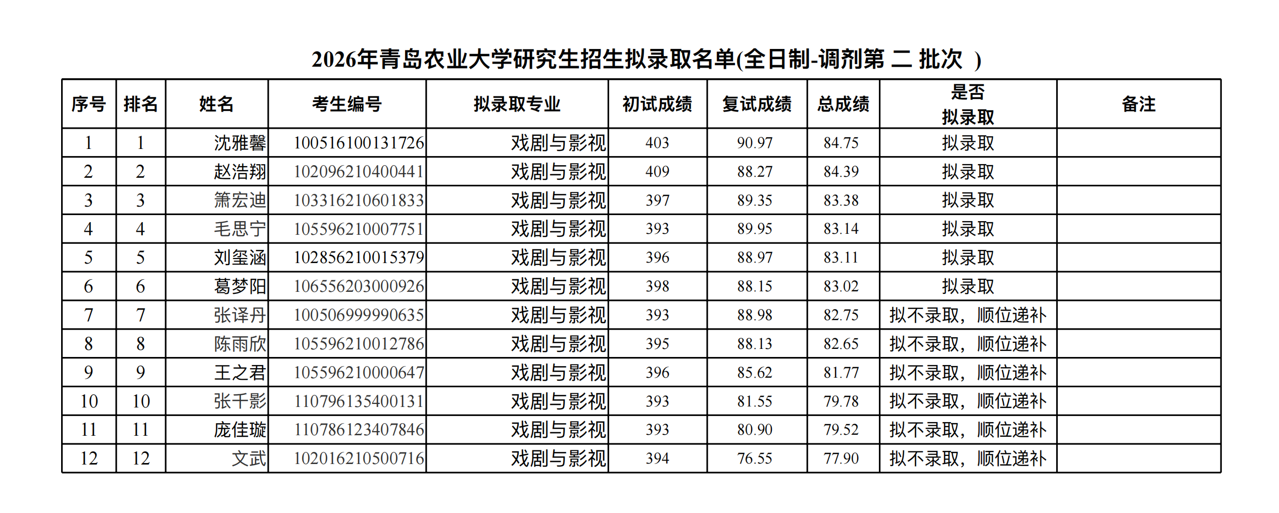 2026年研究生戏剧与影视调剂复试二拟录取名单