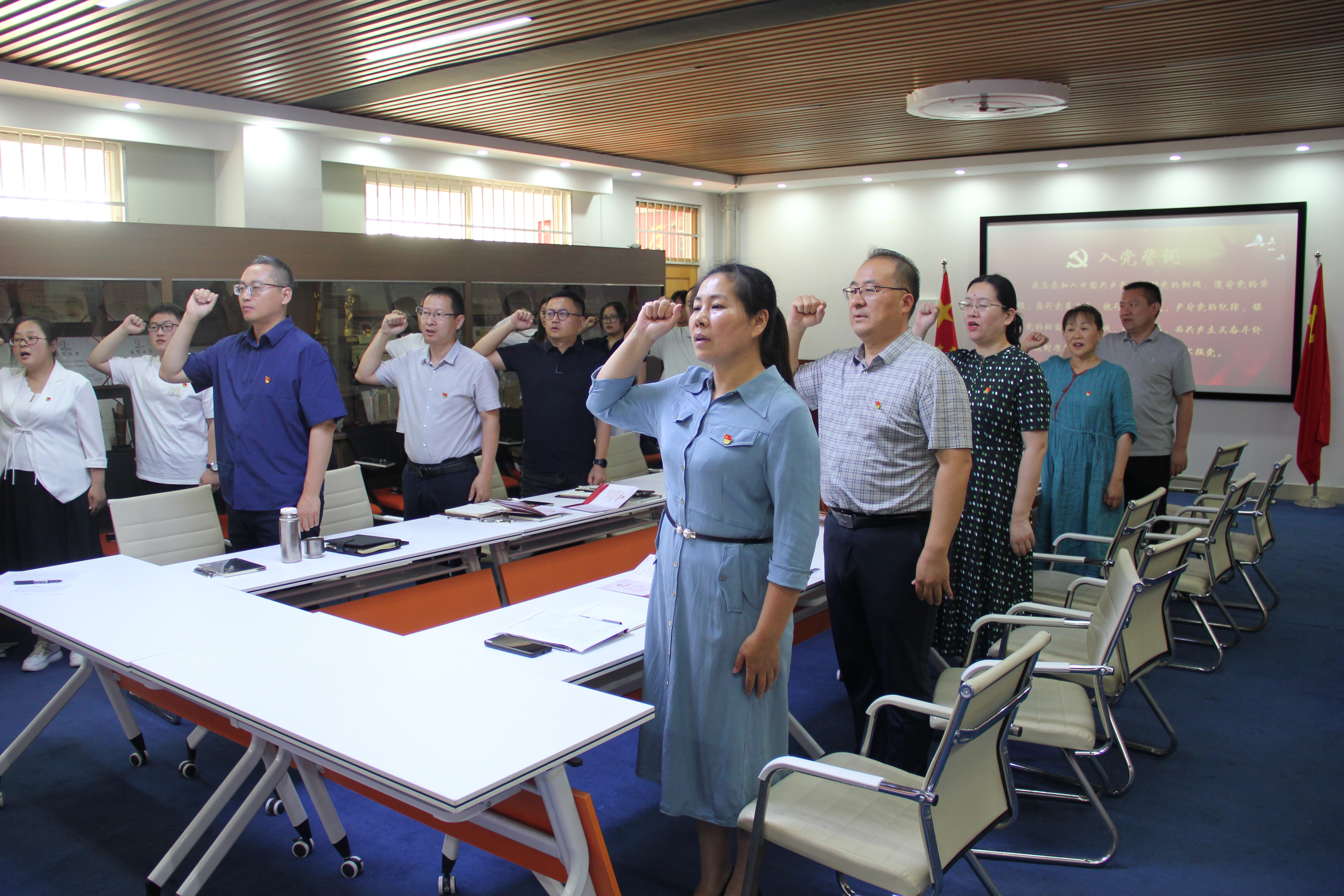 牢记使命葆初心,重温誓词筑党魂。“我志愿加入中国共产党,拥护党的纲领,遵守党的章程……”在支部副书记丁志勇同志的带领下,全体党员面对党旗,队列整齐,右手握拳,再次重温最神圣、最庄严的入党宣誓,铿锵有力的誓言响彻耳畔、融入血脉,激荡在宣誓的每一位党员心中。