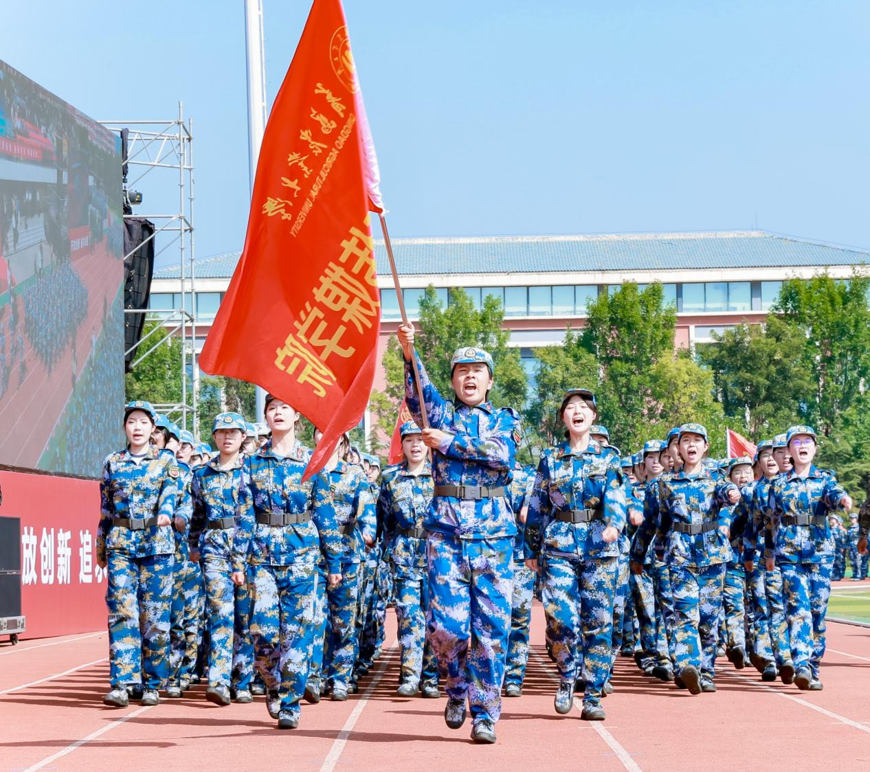 汇演场上,旌旗飘扬、英姿飒爽。太阳集团tyc151cc2025级新生军容严整、目光坚定,步伐铿锵有力,口号响彻云霄,全面展示了两周军训淬炼出的过硬素质与优良作风,生动诠释了传媒学子坚韧不拔、斗志昂扬的精神风貌。