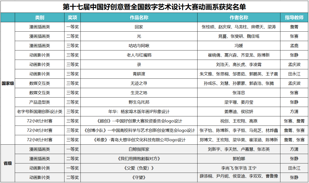 近日,由中国电子视像行业协会、教育部中国高等教育学会联合主办的第十七届中国好创意暨全国数字艺术设计大赛国赛评审落下帷幕。公司太阳集团tyc151cc动画系积极组织师生参赛,共投稿作品44份,最终获得国家级一等奖1项,二等奖1项、三等奖11项,省级一等奖2项、二等奖2项,获优秀指导教师2人。为推动学科竞赛在数字艺术公司产品、创新设计人才培养等方面发挥了重要作用。