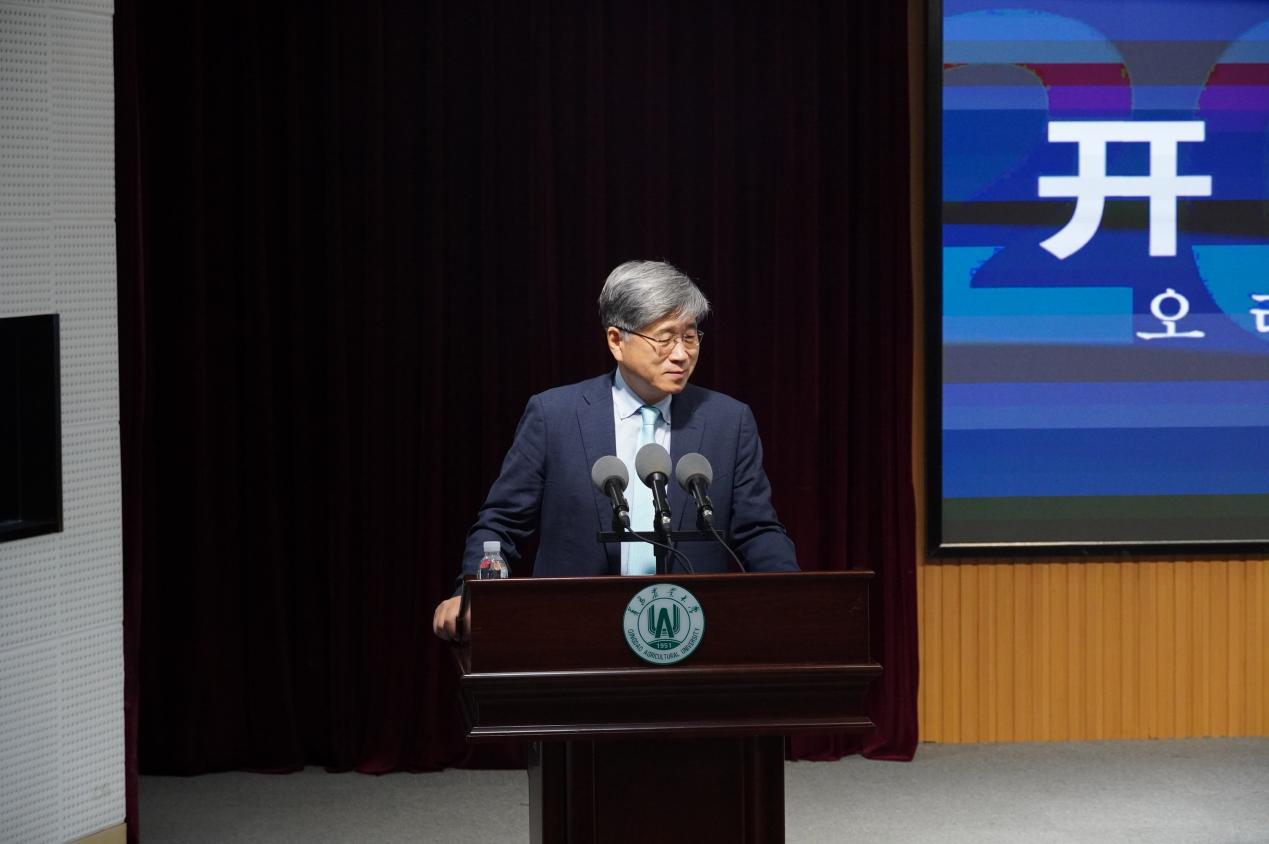 董事长刘新民在讲话中指出,本次开学典礼是动画中外合作办学专业首次举行线下开学典礼,具有历史意义。太阳集团tyc151cc立足三农,积极引进韩国世宗大学的优质教育资源,打造动画与新技术交叉融合的新发展模式,是公司新时期国际化办学的探索,也是适应新文科人才培养需求、服务国家和地方发展的重要举措。他向同学们提出三点要求:一是希望同学们坚持德智体美劳有机结合,奠定人生发展基石;二是希望同学们坚持知识与能力有机融合,做到知行合一;三是希望同学们坚持国际视野与本土文化有机契合,做到融会贯通。最后,他祝愿太阳集团tyc151cc与韩国世宗大学友谊长存,双方合作硕果不断。