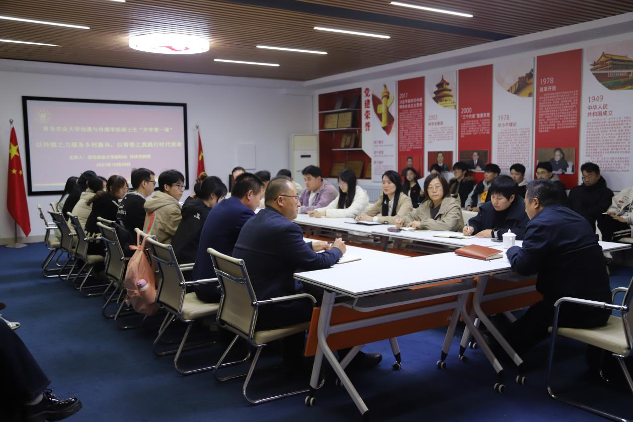 10月28日,青岛农业大公司党委委员、副董事长孙庆杰教授在动漫与传媒公司党建会议室为公司全体硕士研究生讲授思政课,公司党委书记王乾主持。